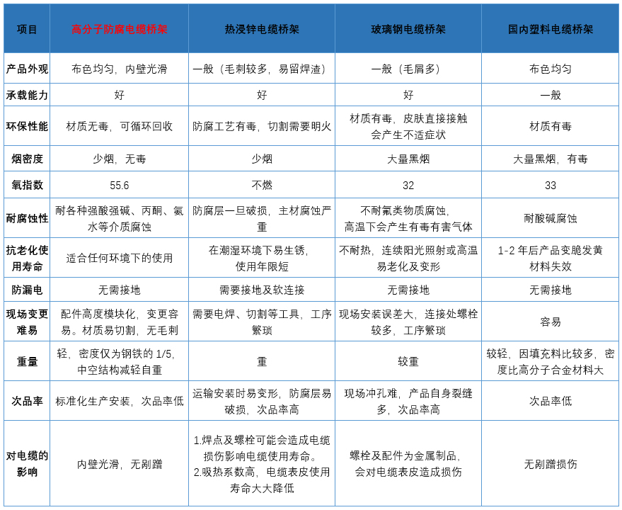 高分子合金电缆桥架是在传统金属电缆桥架的基础结构上进行改造升级,改变金属电缆桥架单层结构,结合塑料挤出工艺,采用PVC、ABS、PS等高分子树脂及多种精细化工助剂,经过塑料改性,应用特制设备、模具挤制制成的一种兼具传统金属桥架载荷能力及塑料制品绝缘阻燃性能、耐腐蚀长寿命性能的新型电缆桥架。高分子合金电缆桥架克服了传统金属电缆桥架金属材质的工况缺陷,适用于潮湿、腐蚀气体、静电、液体、酸碱附着等恶劣环境下的线缆敷设工程。